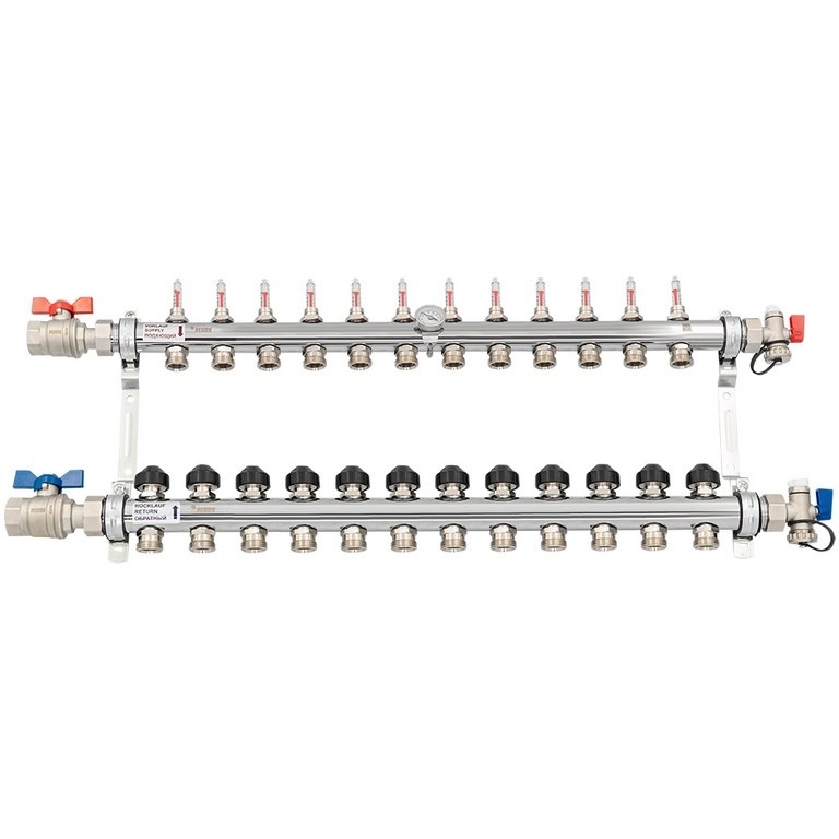 Коллектор для тёплого пола с расходомерами РЕХАУ HKV-D изготавливается из нержавеющей стали и предназначен для систем 2-контурного напольного отопления. Снабжён вентильными